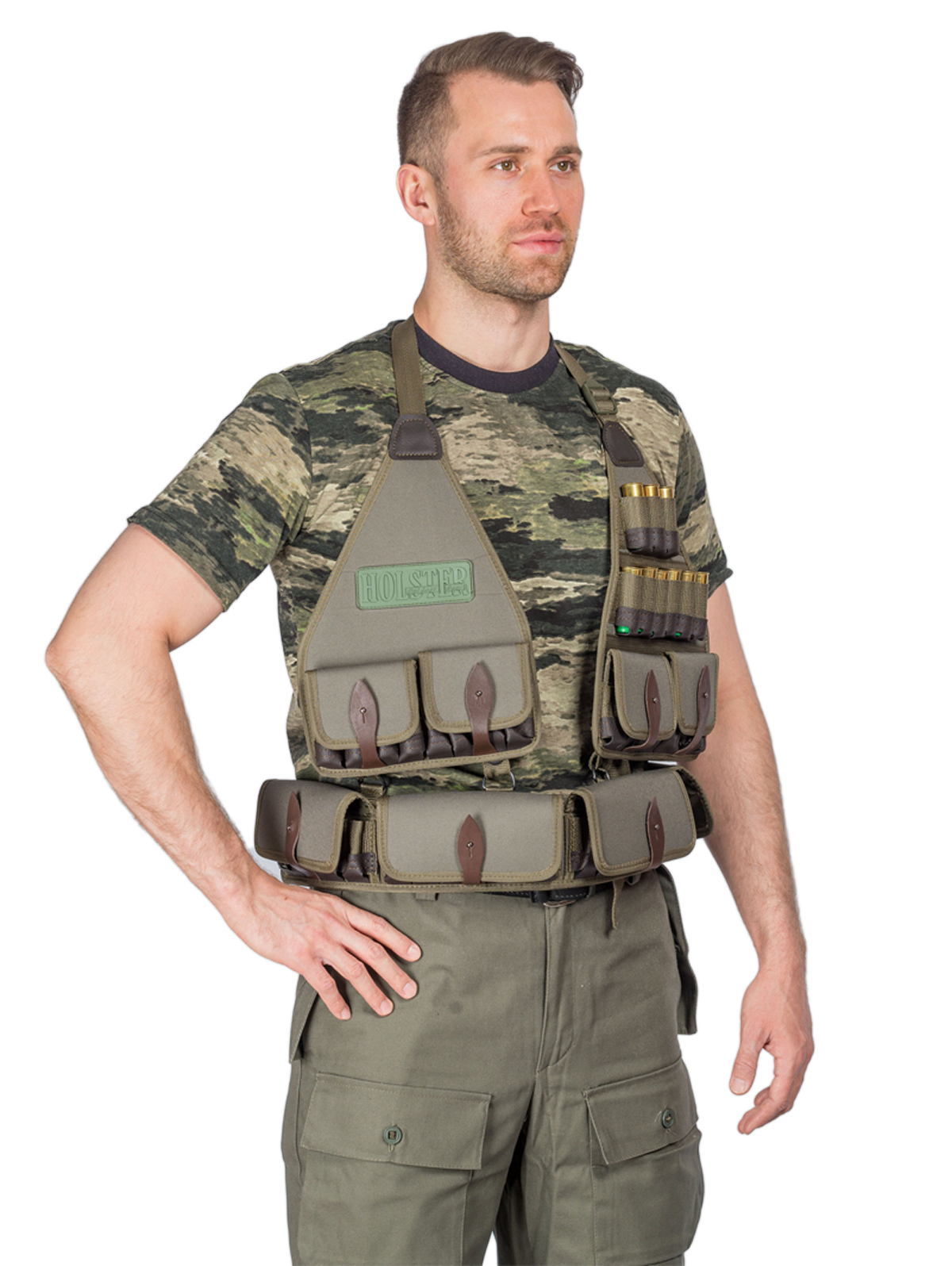 Для защиты от потери и от воздействия влаги, грязи, пыли большая часть гнезд надежно спрятана в карманах с клапаном. Патронташ имеет универсальное применение - верхняя часть может отстегиваться. Оставшаяся нижняя часть представляет собой поясной закрытый патронташ под 24 патрона и может использоваться как отдельное изделие.